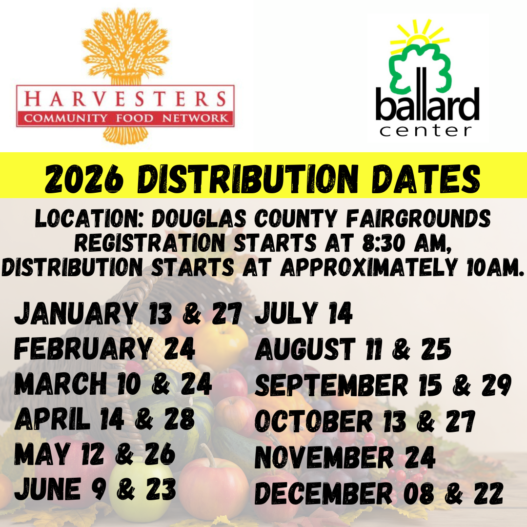 The Ballard Center and Harvesters Mobile Food Distribution takes place at the Douglas County Fairgrounds (19th & Harper St.) on the second and fourth Tuesdays of the month unless noted otherwise in the schedule below.